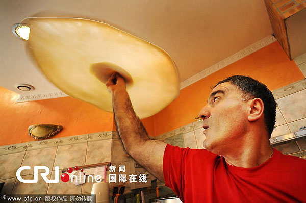 2009年10月22日,法国,世界比萨锦标赛冠军Paolino Bucca在表演杂技比萨。 2009年10月22日,法国,世界比萨锦标赛冠军Paolino Bucca在表演杂技比萨。