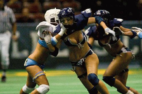 当地时间2009年10月16日,美国女子贴身内衣橄榄球联赛圣迭戈魅力队与达拉斯欲望队的比赛在圣迭戈主场进行。两队女运动员现场贴身"肉"搏,香汗淋漓。