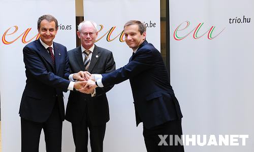 10月29日,在比利时首都布鲁塞尔,西班牙首相萨帕特罗、比利时首相范龙佩和匈牙利总理鲍伊瑙伊(从左至右)出席三国共同主席国标志亮相仪式。当天,欧盟未来三个轮值主席国西班牙、比利时和匈牙利展示了三国共同的主席国标志。标志为连接在一起的字母“EU”,以三个国家的国旗组成颜色为区别。欧盟由成员国轮流担任主席国,任期半年。这是欧盟成员国首次推出共同主席国标志,以加强相互间协调与合作。新华社记者武巍摄