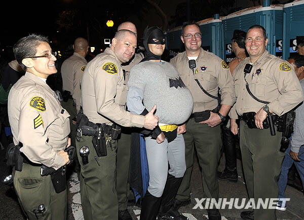 10月31日,在美国加利福尼亚州的洛杉矶,维持秩序的警察与参加万圣节活动的群众在一起合影。新华社记者戚恒摄