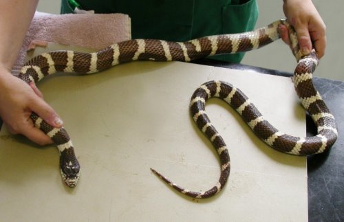 经过一番折腾,送到兽医处的“雷吉”已经筋疲力尽,雷诺兹最终成功将蛇的头部和尾巴分开。野生王蛇广泛分布于从加拿大南部到南美的广大地区,它们体长可达7英尺(2.13米),寿命最长达20年,捕食啮齿目动物、鸟类和其他蛇类等各类动物,偶尔连自己也不放过。