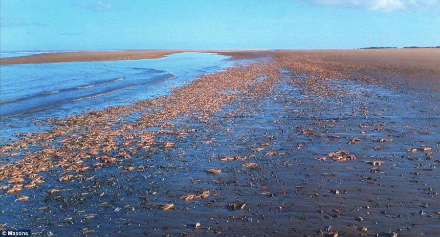 1.海星墓地:超过1万只橙色和粉色的海星搁浅在霍尔勘海滩的金色沙滩上,绵延400多米,它们再也无法回到海里。早晨起来散步的玛格丽特·佩罗特看到这凄惨的景象时,简直就要发狂。她说:“放眼望去,散落在长长海岸上的海星,恐怕有成千上万只。”