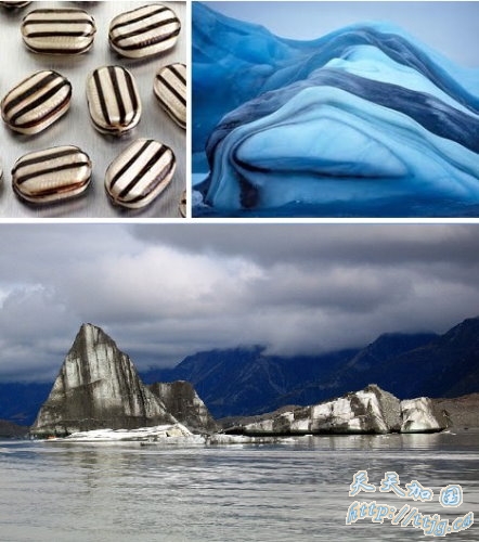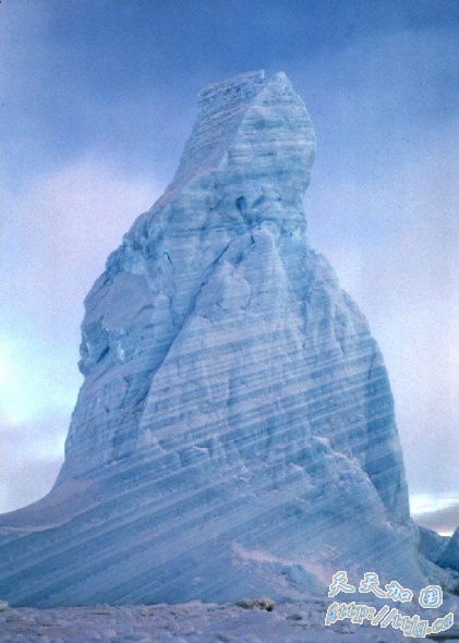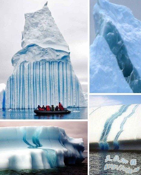 最后一幅图片展示的是另一个条形码状冰山。此时的它正准备开始长途北方之行,从冰冷的南极海域向北飘动数百英里,直至全部融化。对于规则的蓝色条纹,一种可能的解释是它们反映出降雪和温度的季节差异。形象地说,条纹冰山在某种程度上就像是一棵棵被砍倒的树,树的年轮就是其在一年四季的生长记录。条纹冰山的“短命”特性——所有冰山均是如此——只能增加它们的美丽指数。
