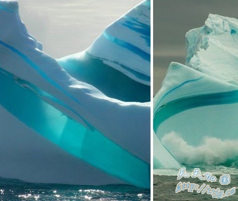 蓝色条纹冰山给人一种难以置信的感觉,它们的数量较其它条纹冰山相比稍多一些。由于大量微小气泡产生的影响,新冰通常呈白色。蓝冰条纹由灌入冰山裂缝的淡水所致,灌入之后迅速冻结。这种冰山实际上是透明的,之所以呈蓝色的原因在于:在红光被吸收过程中,光谱中的蓝光受到反射。左上图展示的条形码状冰山显得非常怪异,只在一半可视区域均匀分布着蓝色条纹。