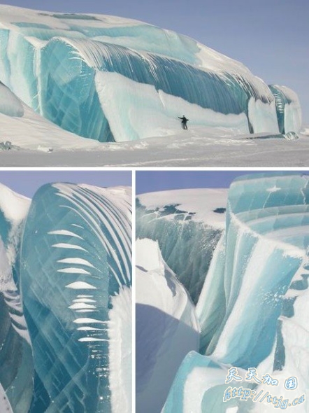 由于经历很多次冻结/解冻周期同时受到来自叠加冰的挤压,流动冰透明程度变得更高,与此同时,表面也布满裂缝和断面。图片展示的“冰冻的潮汐波”将最终进入海洋,形成条纹碧玉冰山,让未来前往南极洲的航海者和游客一饱眼福。能够欣赏到处于萌芽阶段的条纹冰山,我们还要感谢科学家托尼·特拉沃里隆恩,正是他在潮汐波断裂前拍摄了这幅照片。