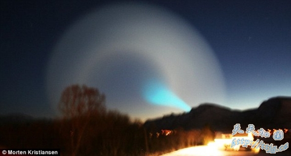 据挪威目击者称,8日晚间,一道蓝光从山后直冲云霄,接着停在半空中开始向四处散播。几秒钟过后,一个巨大的螺旋体笼罩了整个天空。最后,一道青绿色光束从螺旋体中心位置射出。上述现象持续了 10到12分钟后才完全消失。这一奇特景观令当地数千居民感到“无比震惊”。许多人猜测,这一神秘奇景可能与俄罗斯导弹、流星或冲击波有关。而据天文学家介绍,8日晚出现的奇异景观与常见于挪威的北极光没有任何联系。由于神秘光圈持续时间太长,因此不可能是一般的天文现象。一些小报则津津乐道地宣称,人们被飞碟“吓着了”。然而,俄罗斯军方出面澄清,令在冰天雪地中蹲守了很久的广大“飞碟爱好者”感到颇为失望。