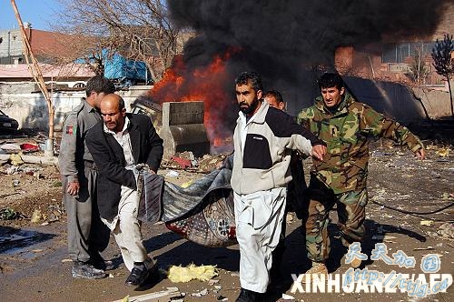 12月15日,在阿富汗首都喀布尔,一名死者的遗体被抬离爆炸现场。阿富汗首都喀布尔的外交和政府人员主要居住区当日上午发生巨大爆炸。