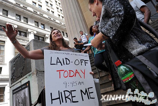 9月14日,在美国纽约华尔街的联邦大厅外,一名失业者手拿标语进行抗议。当日,美国总统奥巴马在华尔街的联邦大厅就金融危机一周年发表演讲。新华社记者谷欣容摄