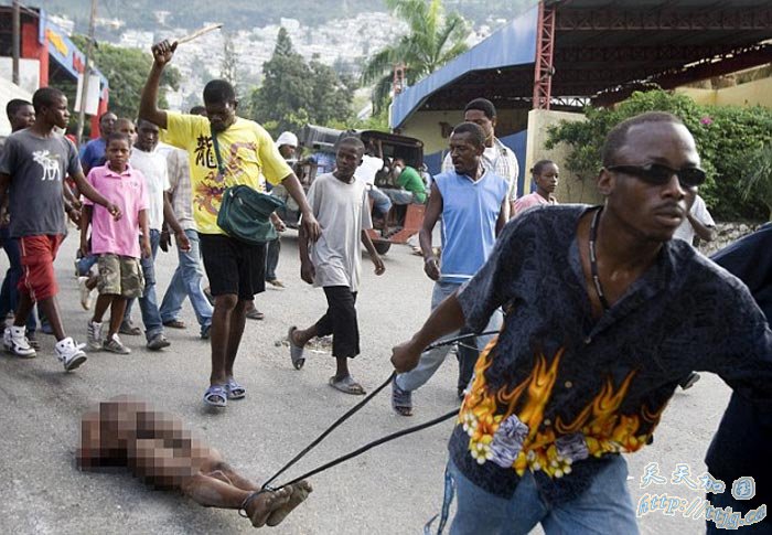2、小偷尸体被拖着通过太子港街道。现在,很多暴力团伙和抢劫者正蜂拥往商店废墟,带走一切可以找到的东西。这些行为正在威胁海地的稳定与安全,民众的担忧也在不断增加。