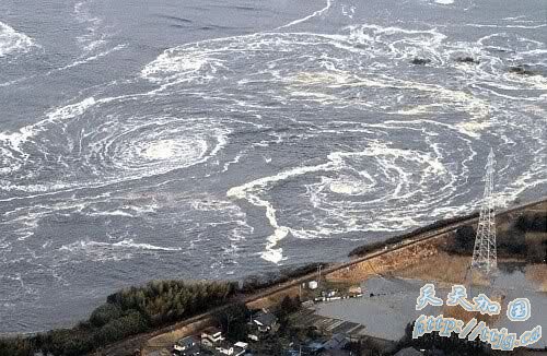 3月11日,日本东北部名取,震后的海啸淹没了大片房屋。海水出现巨大的漩涡。