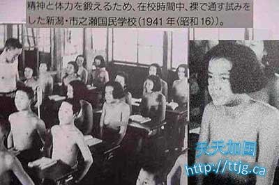 1941 年7月,日本开始实施《国民优生法》等,同时在学校里面让女学生们开始练习弓道,对15岁至21岁的女学生进行千米速跑、投标等等体力测验考试。整个日本要培养“军国女性”,要保护培育一代又一代“军国母子”。图为1941年日本新泻学校中要求男女学生全部裸体上课磨炼精神的场景。