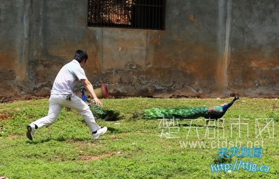 一名男子对孔雀“围追堵截”,只为拔下它的尾羽