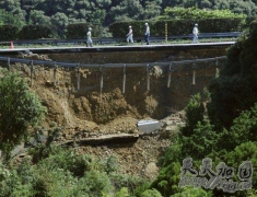 工作人员查看东名高速的损毁情况。 东名高速中断。 日本东京至名古屋高速在静冈县被损毁的路段。 东京至名古屋高速在静冈县被损毁的路段。 新华社照片,静冈(日本),2009年8月11日 这张拍摄于8月11日的照片显示的是日本东京至名古屋高速在静冈县被损毁的路段...