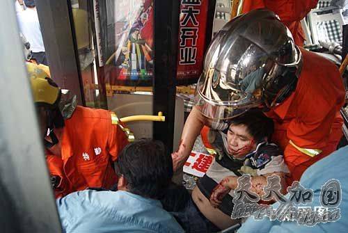 时间就是生命,救援刻不容缓,经过现场勘查后,指挥员吴彬立即下达作战命令展开营救。警戒小组负责现场警戒,同时维护好现场秩序,以便营救工作迅速展开;救援小组一方面负责协助现场民警、医生对受伤乘客进行救助转移,另一方面负责对那名伤势较重的乘客实施紧急破拆救人。