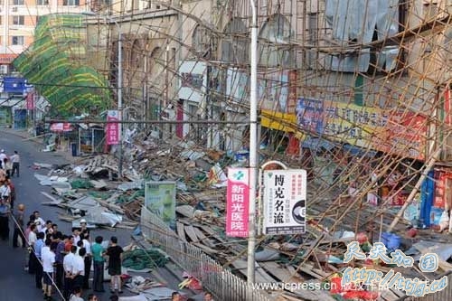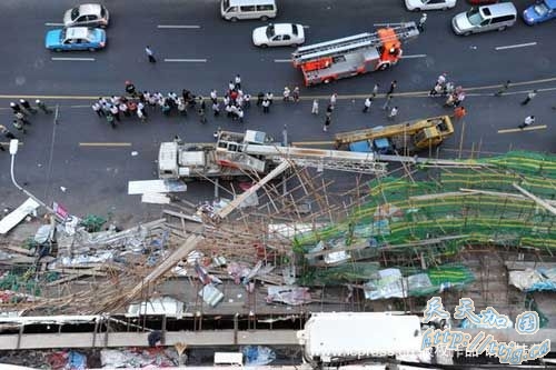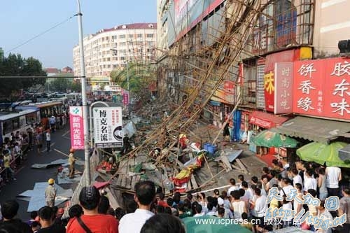 新华网青岛8月16日电 青岛市一商厦施工现场16日下午发生脚手架倒塌事故,造成19人受伤。