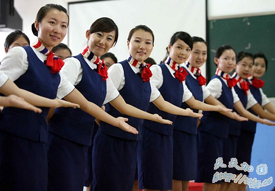 图为引导手势训练,要求面带微笑,姿态整洁。
