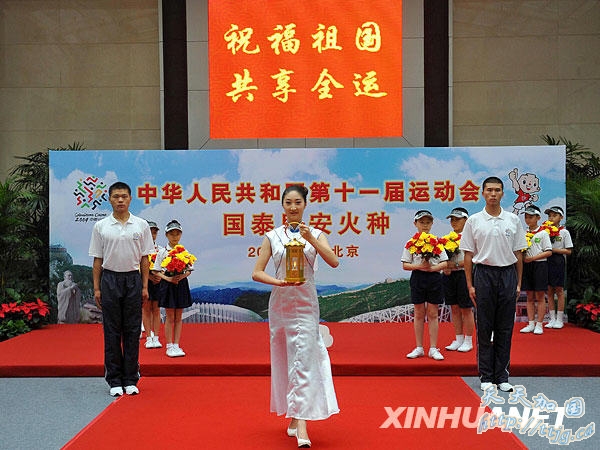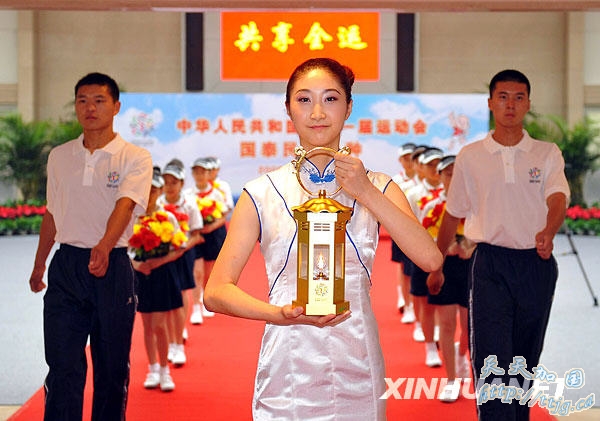 8月16日,第十一届全国运动会火种灯在工作人员护送下从国家体育总局出发,前往人民大会堂东门外广场。当日,以“祝福祖国,共享全运”为主题的第十一届全国运动会火炬传递活动点火起跑仪式在北京人民大会堂东门外广场举行。各省、自治区、直辖市及香港、澳门特别行政区都派代表参加了仪式。新华社记者罗晓光摄