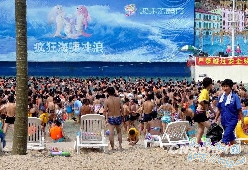 2009年8月18日,山城重庆的最高气温超过40℃以上,室外烈日高照,热浪袭人,许多市民纷纷躲到该市加勒比水世界游泳池内戏水躲避酷热,造成游泳池内人满为患。 中新社发 何伟 摄