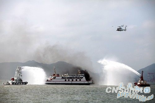 图为演习过程中,“宁舟”轮船舱破损进水,电器设备短路,引发船舶火灾。