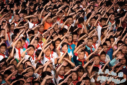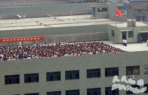 另据东方IC 9月2日报道 2009年9月1日,杭州市中小学校开学的第一天,在外来务工子弟学校——杭州天华学校的新校址,由于没有合适的场地,1575个孩子不得不在该校的楼顶上进行了一场空中的开学典礼。上午8点30时许,开学典礼准时开始,孩子们从两边的楼道按照秩序步入楼顶的平台,大概十分钟后,这个由1500多个孩子组成的方队排列完毕,开学典礼正式开始,由于此时正逢太阳露出云端,楼顶上又没有任何遮阳措施,两三个孩子受不了楼顶的高温,被搀扶到楼下。半小时后典礼结束,孩子们又在老师的组织下有序地退出楼顶,回到教室上课。