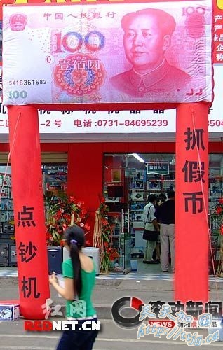“我们的总公司在浙江,我们是湖南的代理商,刚从别的地方搬过来,开业才2天。用人民币图案这个创意是我自己想的,我觉得比较吸引人,也能提醒市民注意防范假钞。”这家店的李经理说。