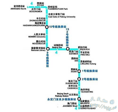 北京地铁4号线是一条贯穿北京市区南北的轨道交通线路,全长28.2公里,是北京第一条引入社会资本投资建设并引入社会运营商运营的轨道线路。4号线以丰台区南四环路的公益西桥站为起点,途经宣武区、西城区,经24个车站最终到达海淀区的安河桥北站。全程行车时间大致为47分钟。 (>>>>>>点击进入北京地铁四号线详细站点示意图)