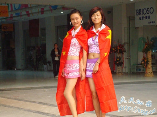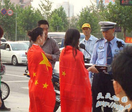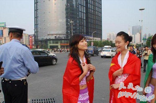大洋网9月28日报道 9月27日下午4时30分左右,郑州金水路曼哈顿广场门口惊现雷人一幕,四名靓丽女子身着艳丽的性感游泳衣,肩披两面崭新的中华人民共和国国旗和两面绿色条幅,拿着新买的舒压按摩器,对正在值勤的交通警察进行“放松”慰问。