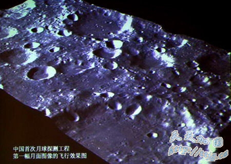 据介绍,中国首次月球探测工程全月球三维数字地形图,就是由CCD立体相机获取的影像数据, 经三线阵数字摄影测量处理制作而成。地形图采用均地极轴坐标系,高程基准采用月球半径为1737.4公里的正球体表面,空间分辨率为500米,平面中误差 192米,高程中误差120米。