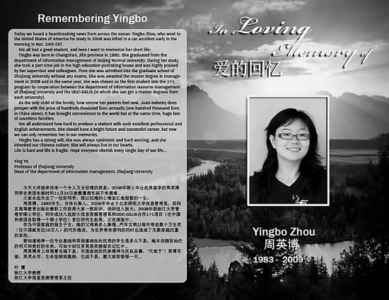 昨天电话在平时少有来电的时间忽然铃声骤然响起,当我拿起听筒,电话的另一端是远在大洋彼岸的美国UIUC图书信息学院院长Prof. John Unsworth和UIUC消防图书馆馆长Dr. Lian Ruan,他们的越洋电话带来一个令人心碎的消息:我们的首位双硕士研究生周英博于当地时间11月24日凌晨在车祸中不幸遇难…
