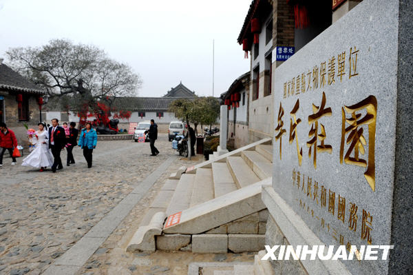 12月2日,一对新人从牟氏庄园大门外经过。庄园6个大院大门台阶都是7层,寓意步步登高,样样齐全。新华社记者 李紫恒摄