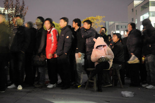 在现场,近千位排队者有很多都自带凳子,还有人给大家发放手写的“号子”。该楼盘一共有600多套房源,除去100多套合作单位和员工的“内部房”,实际可售的房源只有400多套,而开发商当天的放号将只到600个号为止。这意味着许多人在冷风中排上一晚上的队,很可能依然买不到一套房子。