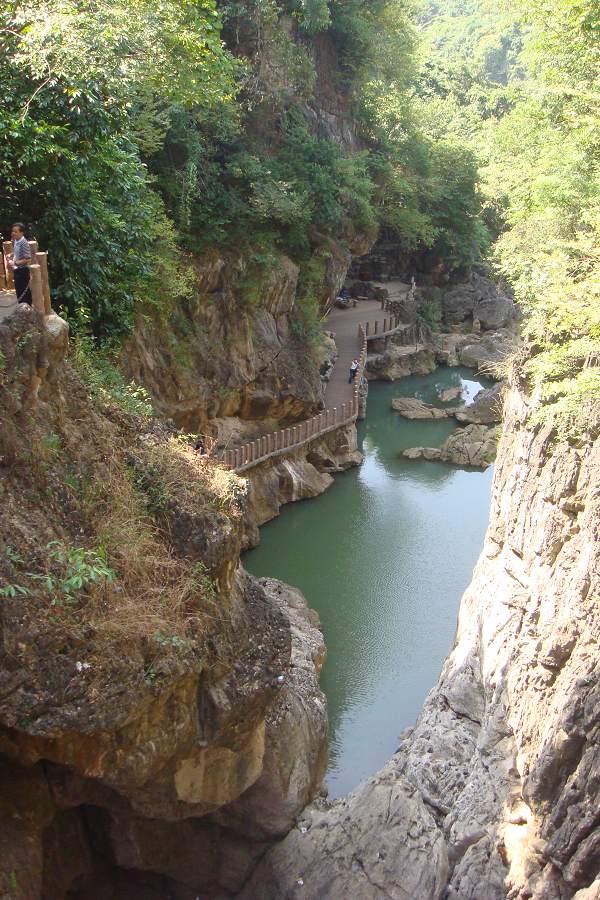 我们先到黄果树瀑布附近的天星桥景区,穿过了多姿的钟乳石岩洞后,又得以欣赏水中石林。然后乘车到了几公里外的黄果树公园的进口。原本以为在进口就能听见喧嚣的水声了,谁知竟然是静悄悄的。估计因为不是周末的原因吧,从进口进去穿过盆景公园,一路上游人都非常稀少。将近走了1公里多路,700-800米外的大瀑布豁然跃入眼帘。聆听着那奔流而下河水轰鸣声,遥望着溅落湖水中泛起的水汽在阳光下形成的七色彩虹,真是令人叹为观止。这时通往瀑布的小路分成了上下两条,我们在东道主的建议下选择了山上的小路。这条路把我们一直带入了瀑布的身后。原来在瀑布的后面有一个穿过瀑布的水帘洞,我们在水帘洞中被飞溅的水花淋的透湿。从洞口探头向下一看,天哪,千仞绝壁就在脚下。