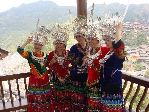 我们中午赶到千户苗寨去用午餐。快到时,主人在车上就提醒我们,苗寨人非常好客,他们敬的自酿米酒是没有停的。果然,车刚停好,全副盛装的苗家姑娘们就拥了上来,从下车酒开始,入门酒,上楼酒,歇息酒,饭前酒,饭间酒,饭后酒,下楼酒,再来酒,真的是没有停过。那自酿米酒酒精度数至少有30度左右,比起偶尔喝的葡萄酒来酒精含量可是要高多了。我们海外媒体一行人个个都被敬了7-8碗,而男士们被热情的苗家姑娘至少灌了18碗,都成了醉仙一般,不慎酒力的人还真顶不住。