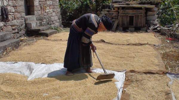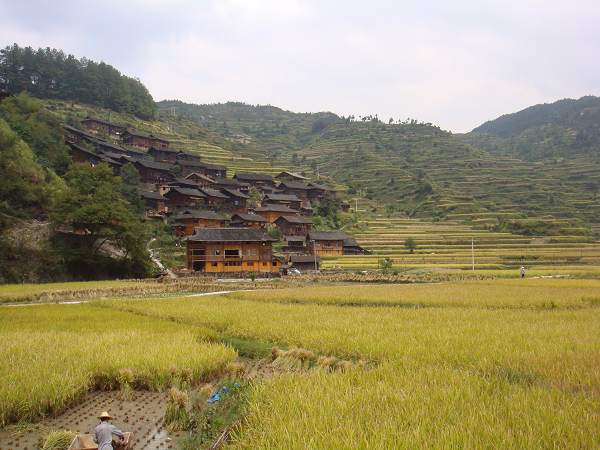 喝完酒我们上了小电瓶车开始游览千户苗寨。这千户苗寨真的是得天独厚,共有千余户人家坐落在群山之中。寨中有清溪穿寨而过,溪上横卧数座风雨桥。远处依山而建吊脚楼层层至山顶,最高处为苗王居所。寨子外侧有梯田无数,引泉水灌溉,稻谷芬芳。秋季正值收获,寨民们以最原始的方式在田间收割打谷。寨中每天下午两点有免费表演,但我们因为路上耽搁,演出团特地为我们加演了一场。少数民族的舞姿一般,但服饰却很有特色,尤其是一个表演者能用树上随便摘下的叶子含在口中吹奏出美妙的歌曲。我们大家看似简单,也把树叶放到了嘴里,可是即便脸涨成了猪肝,也是一点声音也发不出来。