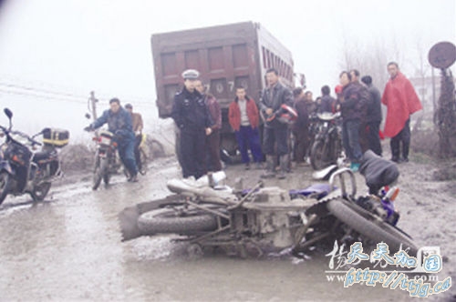 事发地点是在六合的八百桥塔山路,这里是一段三岔路口,正好有一个坡度,地面上一片泥浆,显然,马路比较湿滑。一辆运砂石的渣土车停在路的中央,而在车身后,一辆摩托车横倒在马路上。在两车之间的地面上,趴着一名30岁左右满身是血的女子,一动不动,旁边一名4岁大的小女孩哭得正厉害,她左脸上有一个伤口,还在流血。令人不忍观看的是,小女孩拼命地摇着地上躺着的妈妈,可惜妈妈却不能答应她了。随后,小女孩被旁边的路人抱起来。而在离事发现场约百米处,一名浑身是泥浆的高个男子将另一名男子按倒在坡上,带着哭腔喝斥道:“看你往那里跑,跑到天边我也要追到你。”