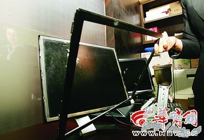 昨日下午,军安王朝大酒店工作人员在被砸烂的电脑液晶显示器前介绍事情经过。事件造成酒店经济损失约五万元