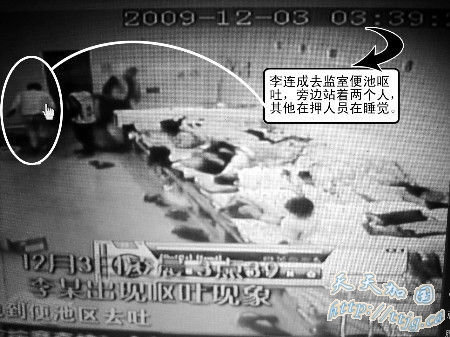 死者家属多次向泰兴警方要求公开监控录像,都遭到拒绝。16日,记者几经周折,找到了江苏电视台播放的部分监控录像内容。录像显示,12月3日凌晨3点39分,李连成跑到监室的一个角落开始呕吐,这时有两名男子给他捶背,还有人给他拿衣服披上。