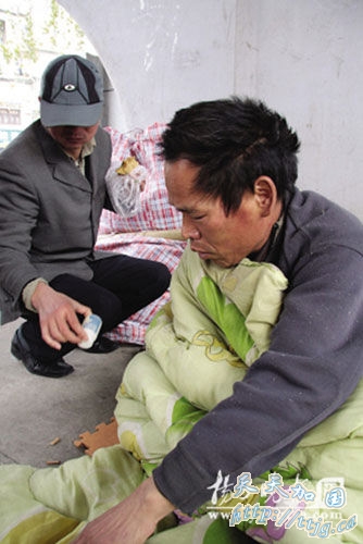 记者随后来到“大傻”所睡的位置,发现这位绰号“大傻”的民工并没有睡着,见到记者也是两眼迷茫,后来他告诉记者,自己名叫王震学,今年46岁,安徽阜阳人,父母过世,只剩下自己孤身一人在外打工求生活,由于腿疼、肺部也有毛病,所以干不了重活,20天前得了重感冒,一直以来发烧不止,后来是一位在附近卖烤红薯的老师傅给他买了一瓶安乃近。和王震学睡在一起的小汤说,王震学已经20多天没有起过床,这几天也是基本吃不下饭,我真怕再不将他送进医院,他也只有等死了。