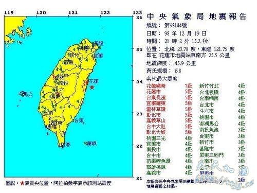 中国网12月19日报道 综合外电报道 2009年12月19日21时03分,台湾花莲东南方海域(23.86,121.66)发生6.7级地震,目前还没有伤亡报告。全台均有震感,持续数十秒,其中花莲地区震感最为强烈,台北、彰化、澎湖都有震感。