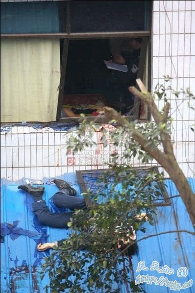 视频说明:在一楼楼顶的彩钢棚上躺着一具男尸,而凶犯则在二楼窗户旁劫持着其妻子,凶犯随后走到彩钢棚上挥舞菜刀,情绪非常激动。