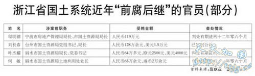 事实上,据统计,不仅是浙江,近年来落马的贪官不少都与房地产潜规则下的腐败有关,财政部原副部长朱志刚,北京市原副市长刘志华,山东省委原副书记、青岛市委原书记杜世成,天津市政法委原副书记、天津市人民检察院原检察长李宝金,湖南省郴州市原市委书记李大伦,安徽省原副省长何闽旭,昆明市规划局原局长曾华,上海房地局原副局长殷国元,江苏省苏州市原副市长姜人杰,重庆市规划局原局长蒋勇,重庆市沙坪坝区原副区长陈明,福州市国土资源局原局长王炳毅,福州市仓山区土地局原局长李仲……都与房地产腐败有关。