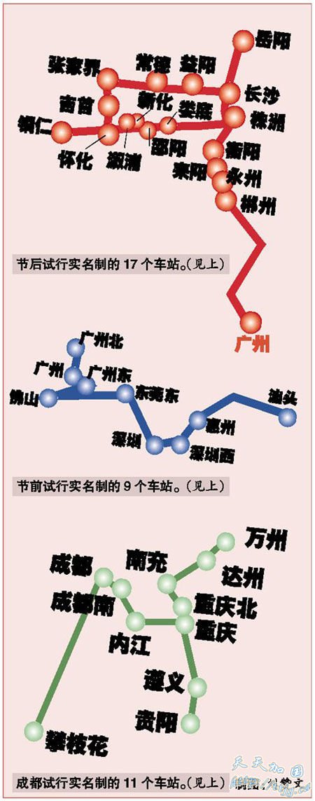 节后,2010年2月14日-3月10日,在广铁集团公司的岳阳、长沙、株洲、衡阳、耒阳、郴州、张家界、吉首、怀化、铜仁、常德、益阳、娄底、邵阳、永州、溆浦、新化17个车站试点火车票实名制。在成都铁路局的成都、成都南、重庆、重庆北、南充、达州、贵阳、遵义、内江、万州、攀枝花11个车站试行火车票实名制。