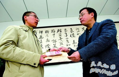 8日上午,在全国“扫黄打非”办公室的一间会议室内,小张从全国“扫黄打非”办负责人黄晓新手中接过万元现金。小张去年12月5日通过传真给全国“扫黄打非”办发了一封信,信中他讲了自己和周围同学所受“黄网”之害,并举报了32个黄色网站。