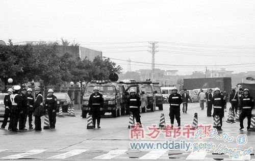 去年12月30日上午,东莞东坑镇新东泰娱乐城与右边东珠酒店之间的一条大路旁站了许多警察,在封锁线里停着多辆警车,其中有14辆装甲车。