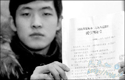 手拿判决书的李凯强希望通过媒体寻找目击证人,为自己讨回公道