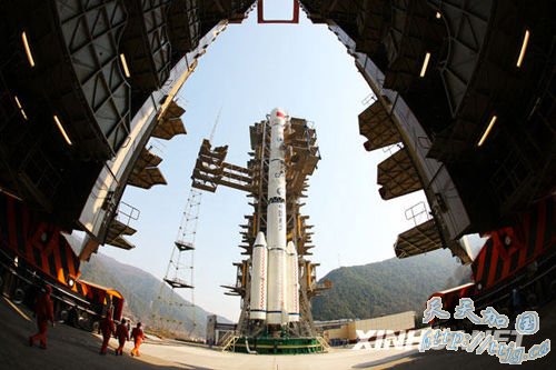 1月16日15时45分,在西昌卫星发射中心,中国第三颗北斗导航卫星在活动塔移开后露出真容。新华社发(秦宪安 摄)