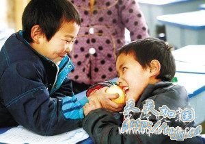 包时雨的午餐是从家里带的苹果,他和同桌分着吃。