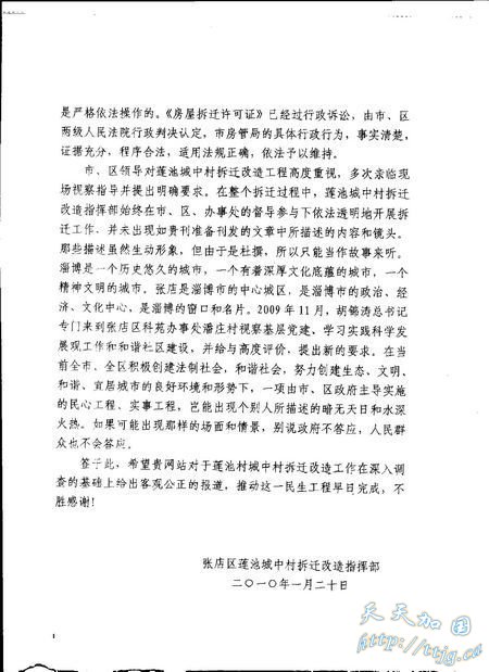 2010年1月14-16日,记者亲赴淄博,对山东省淄博市民反映的庄园房地产公司拆迁环节违法、违规等问题,进行了采访调查。