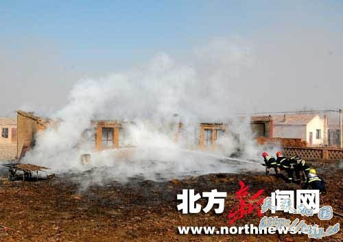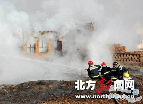 27日,呼和浩特市土左旗一花炮厂爆炸。图为消防官兵正在奋力扑救春花花炮厂厂房的大火。