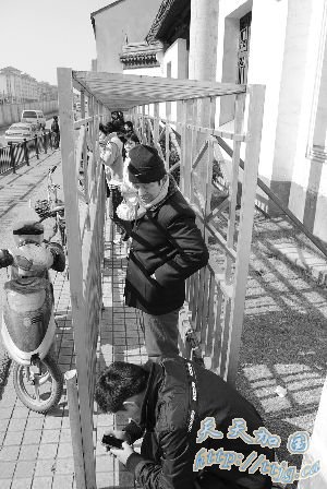 “咦,钻进铁笼子排队,真是新鲜。”一位骑自行车的老先生路过火车票代售处,停下车来瞧热闹。他是第一次看到这样排队买票的,他也意识到代售点此举是为了防止购票人乱插队,“不过,让人挤在笼子里排队买票,还是在闹市区的路边,很不雅观。他们是人,不是动物园的动物。”